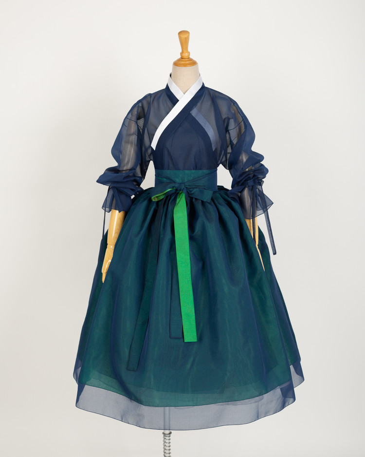 푸른빛과 녹빛이 반짝이며 흐르는, 공작의 깃털처럼 빛나는 한복