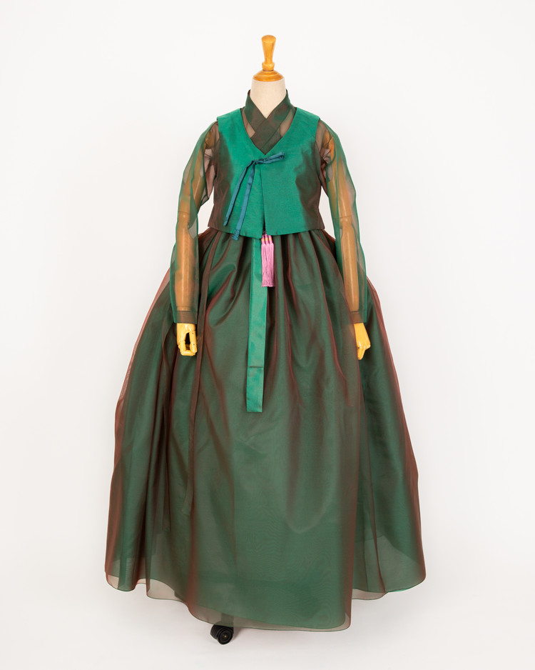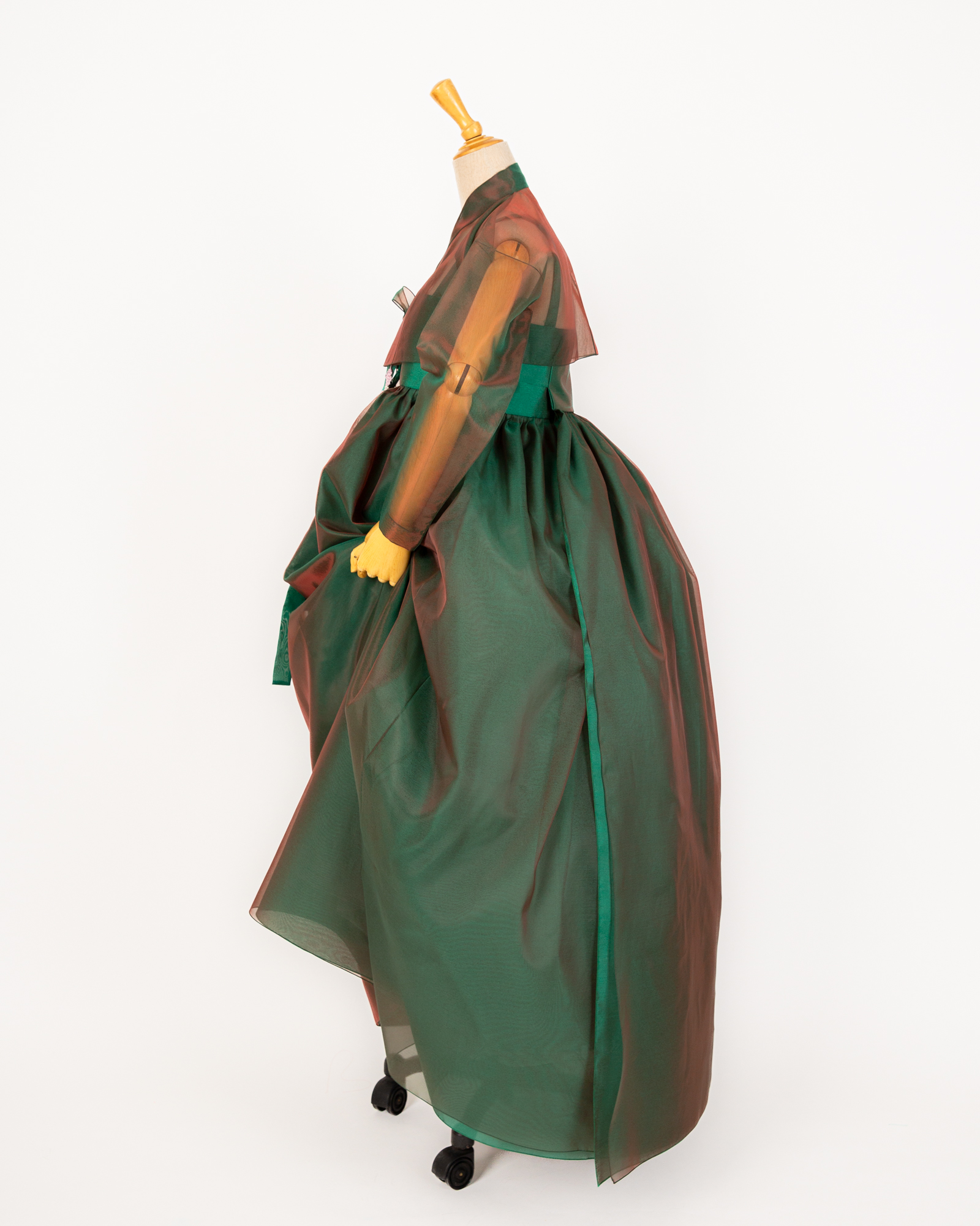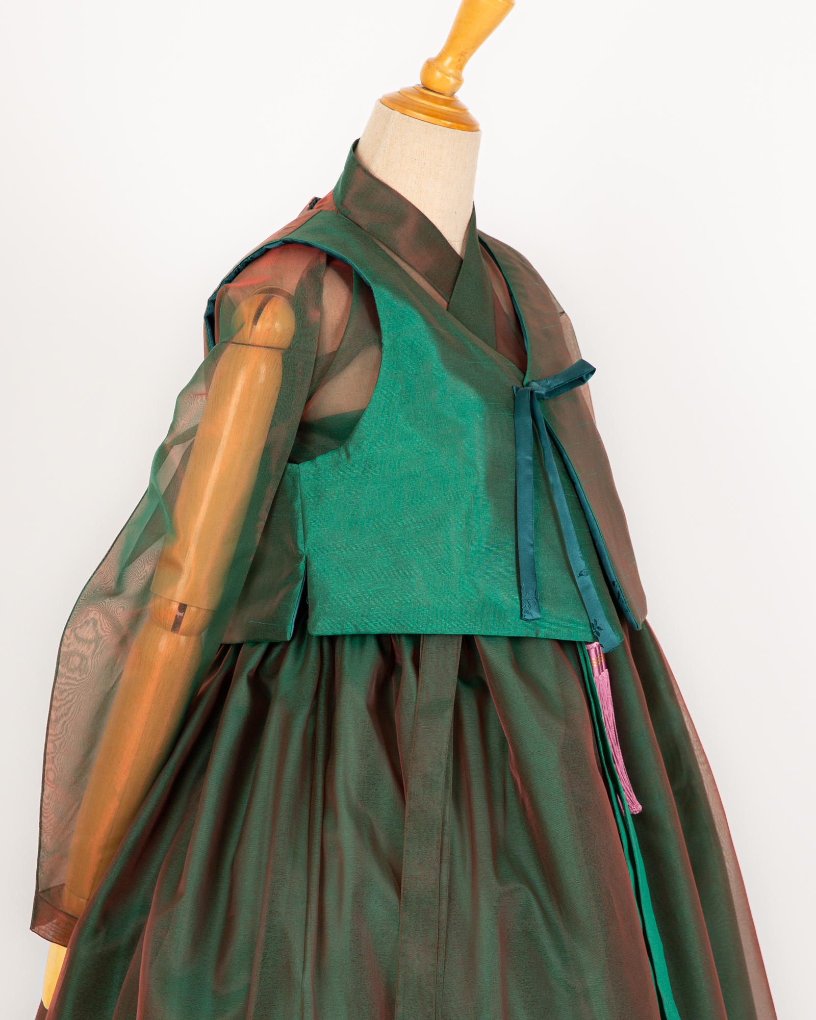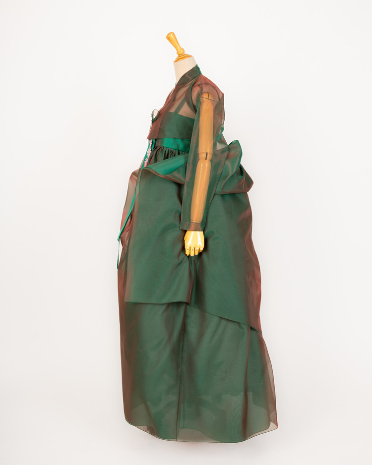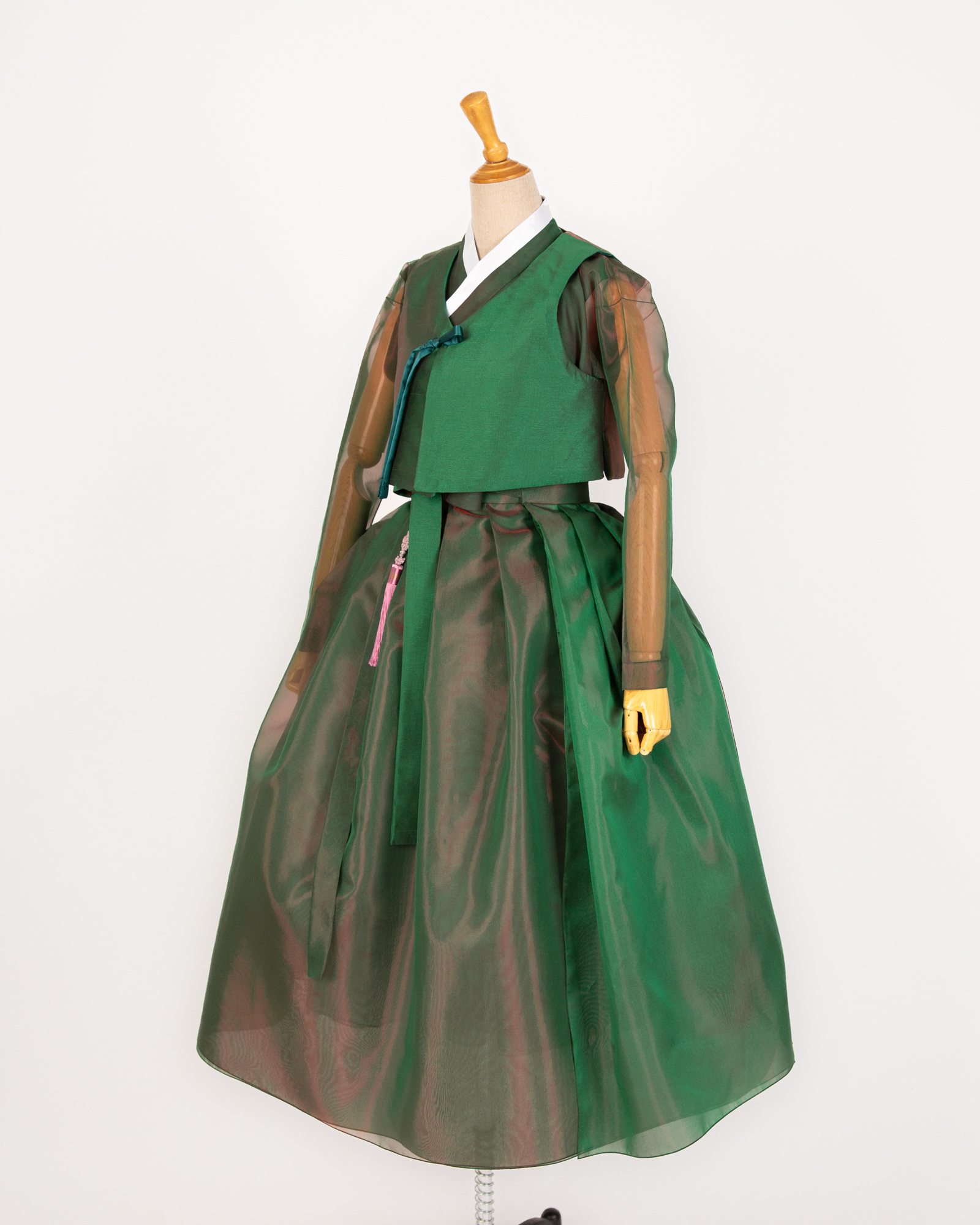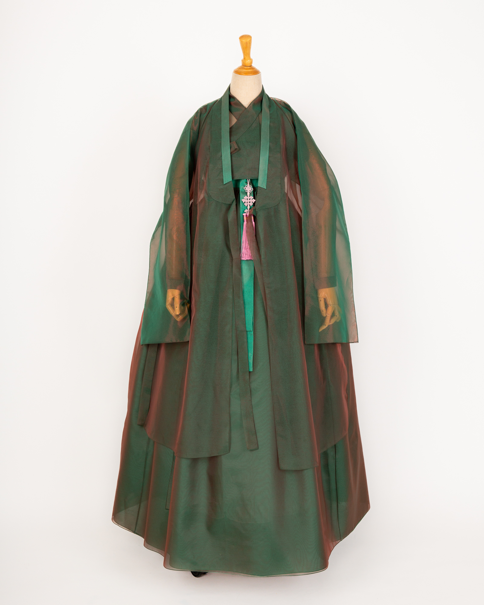 한복의 핵심 구성 요소인 깃, 고름, 동정, 섶을 생략하지 않고 평면패턴으로 제작하여